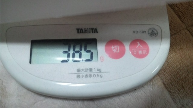 目盛りは飛びたち直前で反動がかかり38.5gになっていますが