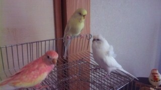 ルビノー4番、大型セキセイ、羽衣セキセイDFの仲良しショットです。